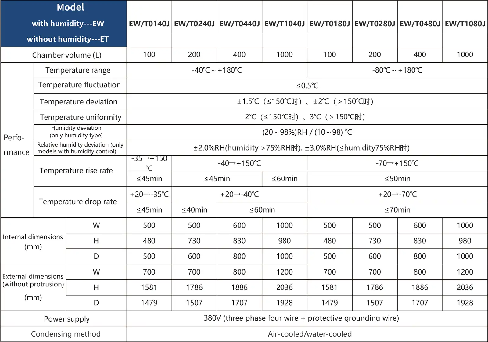 Os dados de desempenho listados para unidades refrigeradas a ar são medidos em condições ambientais de +25 °C e umidade relativa não superior a ≤85%, com a câmara vazia e sem ventilação. Para unidades refrigeradas a água, o desempenho é especificado em uma faixa de temperatura ambiente de +15 °C a +35 °C, umidade relativa de até ≤85% e temperatura da água de refrigeração igual ou inferior a ≤+28 °C, também medida sem amostras de teste dentro da câmara.