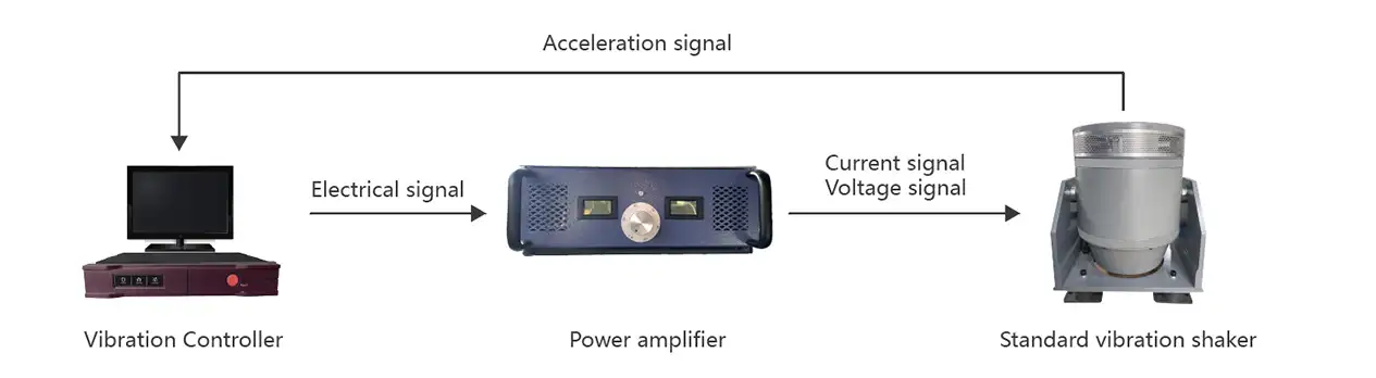A vibração ou o movimento de choque são gerados pelo vibrador em resposta a um sinal de acionamento amplificado que se origina no controlador. O acelerômetro fornece o sinal coletado ao controlador para correção em tempo real e o envia de volta ao amplificador de potência.